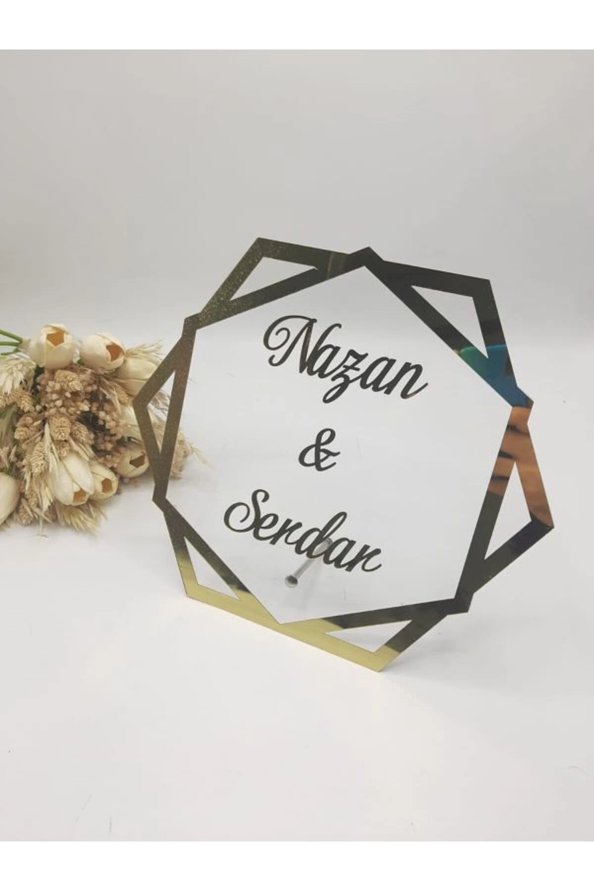 28x25 Cm Altıgen Masaüstü Pleksi Isimlik Söz Nişan Kına Gold