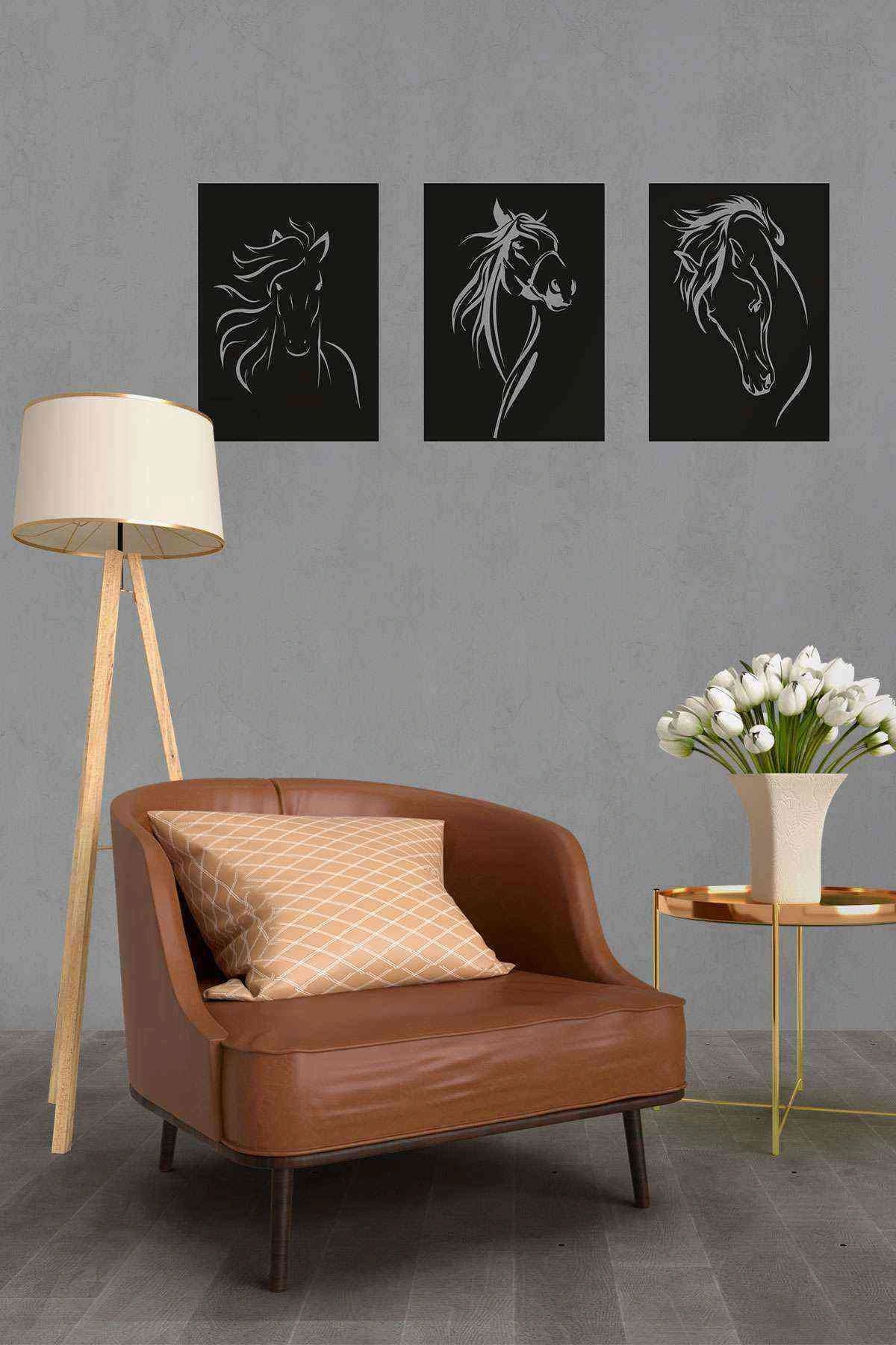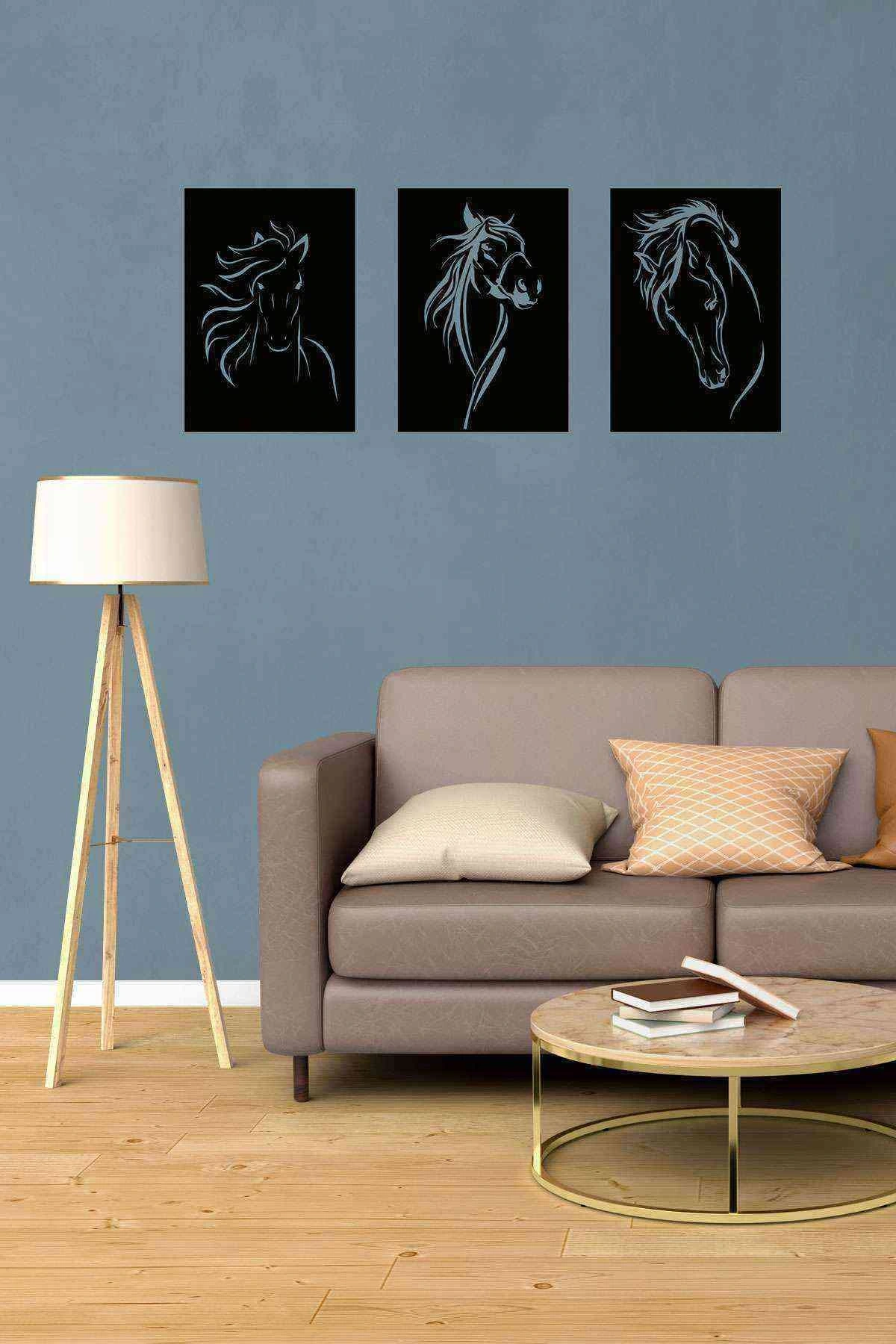At 3 Lü Duvar Dekoru Tablosu Siyah Ahşap Lazer Mdf