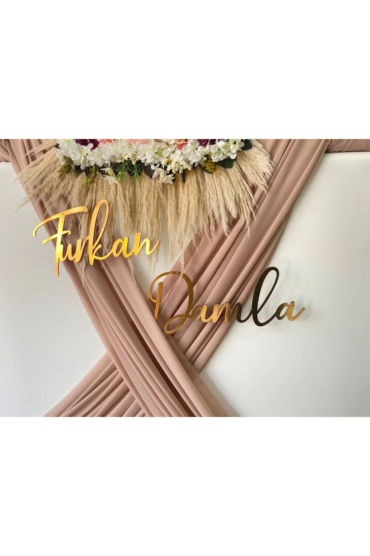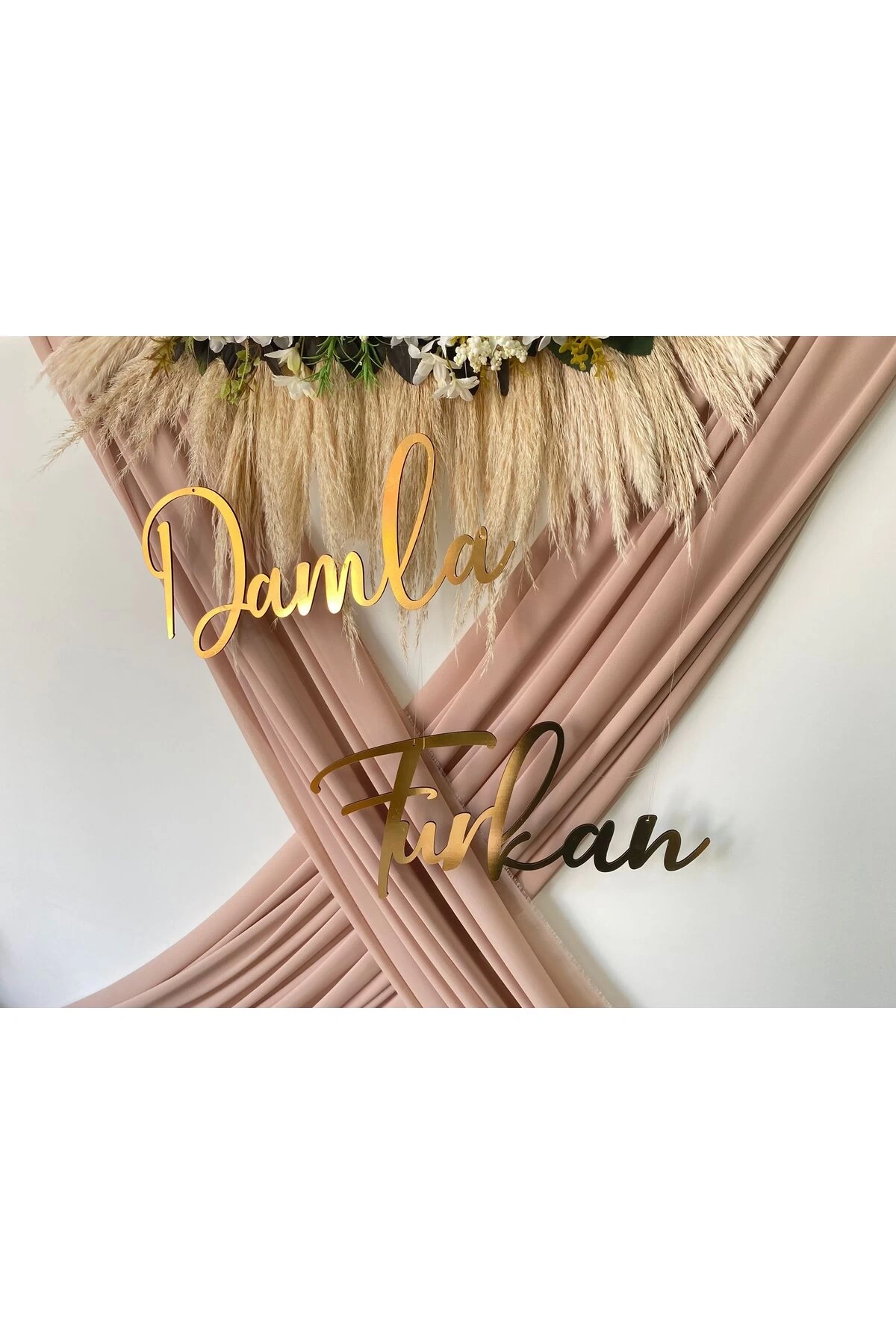 Ürün 3 mm Mdf ahşaptan üretilmektedir.; Ahşap üzeri folyodur.; Paket içeriği 2 adet isimdir.; 1 adet isim ölçüsü 40 cm dir.; Görseldeki şekilde asıldığında toplam 1 metrelik alanı kaplamaktadır.; İsimleri belirtmek için lütfen siparişlerim kısmından satıcıya soru sor bölümünden bize isimleri belirtiniz.; Veya sipariş numaranız ile beraber yazılacak isimleri yazarsanız siparişinizi hazırlayıp kargolamasını yapabiliriz.; ; ;