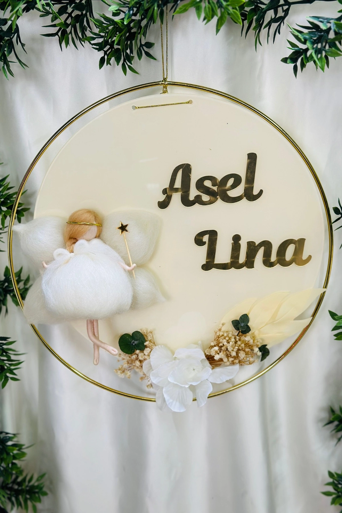 Pleksi Keçe Peri Bebek Kapı Süsü İsimlik Çemberli Makrome 30x30 cm