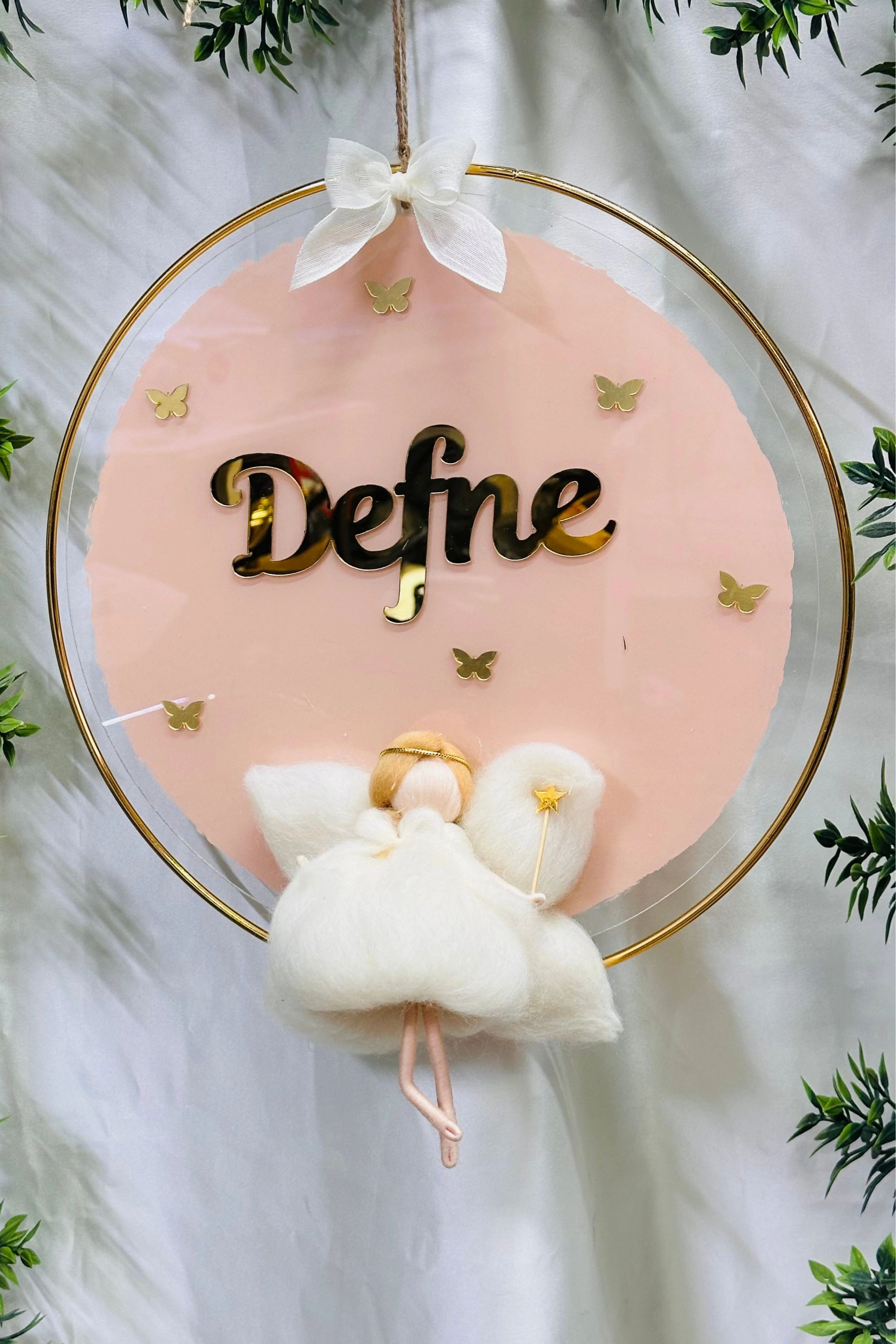 Pleksi Keçe Peri Bebek Kapı Süsü İsimlik Çemberli Makrome 30x30 cm