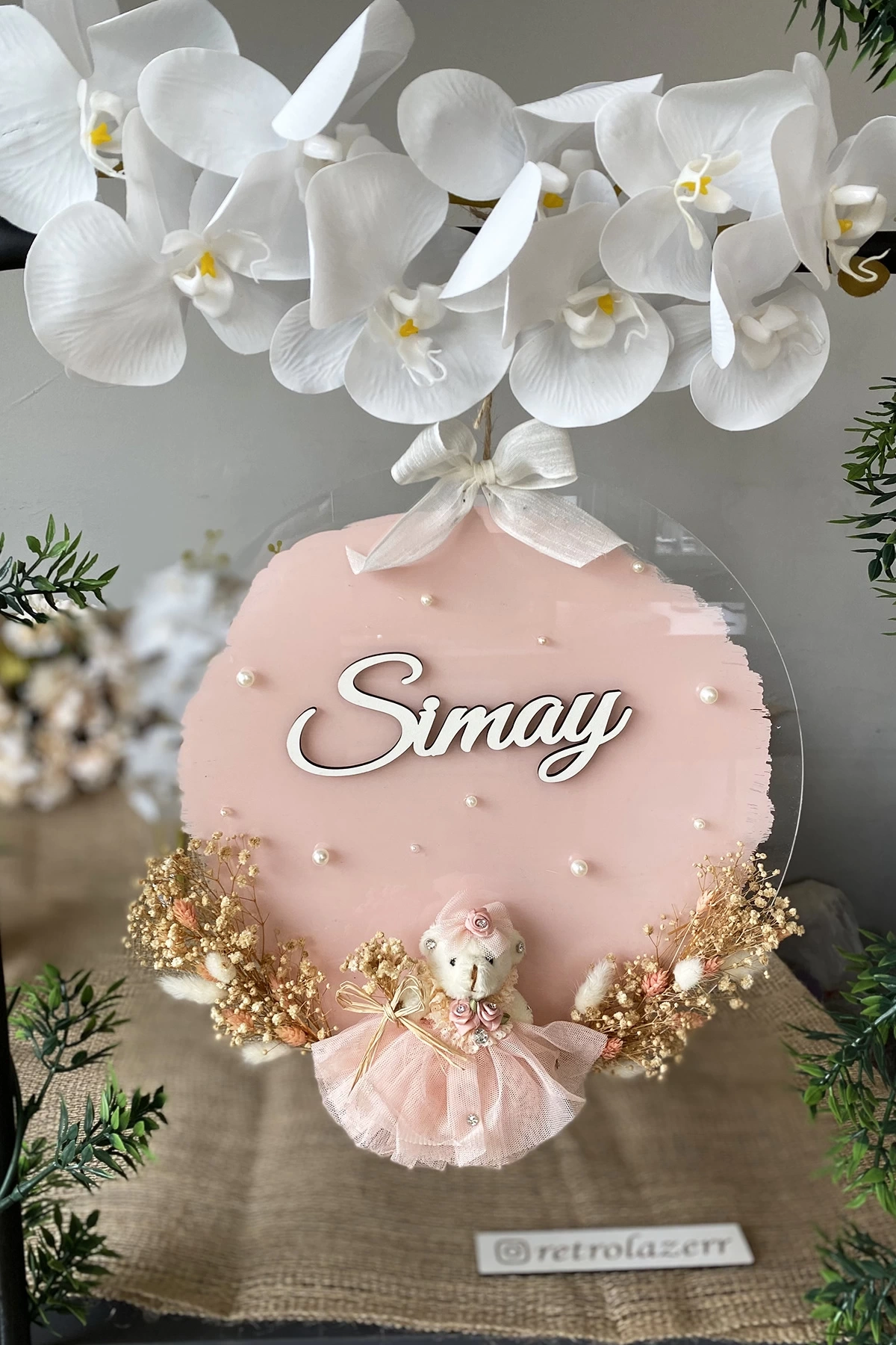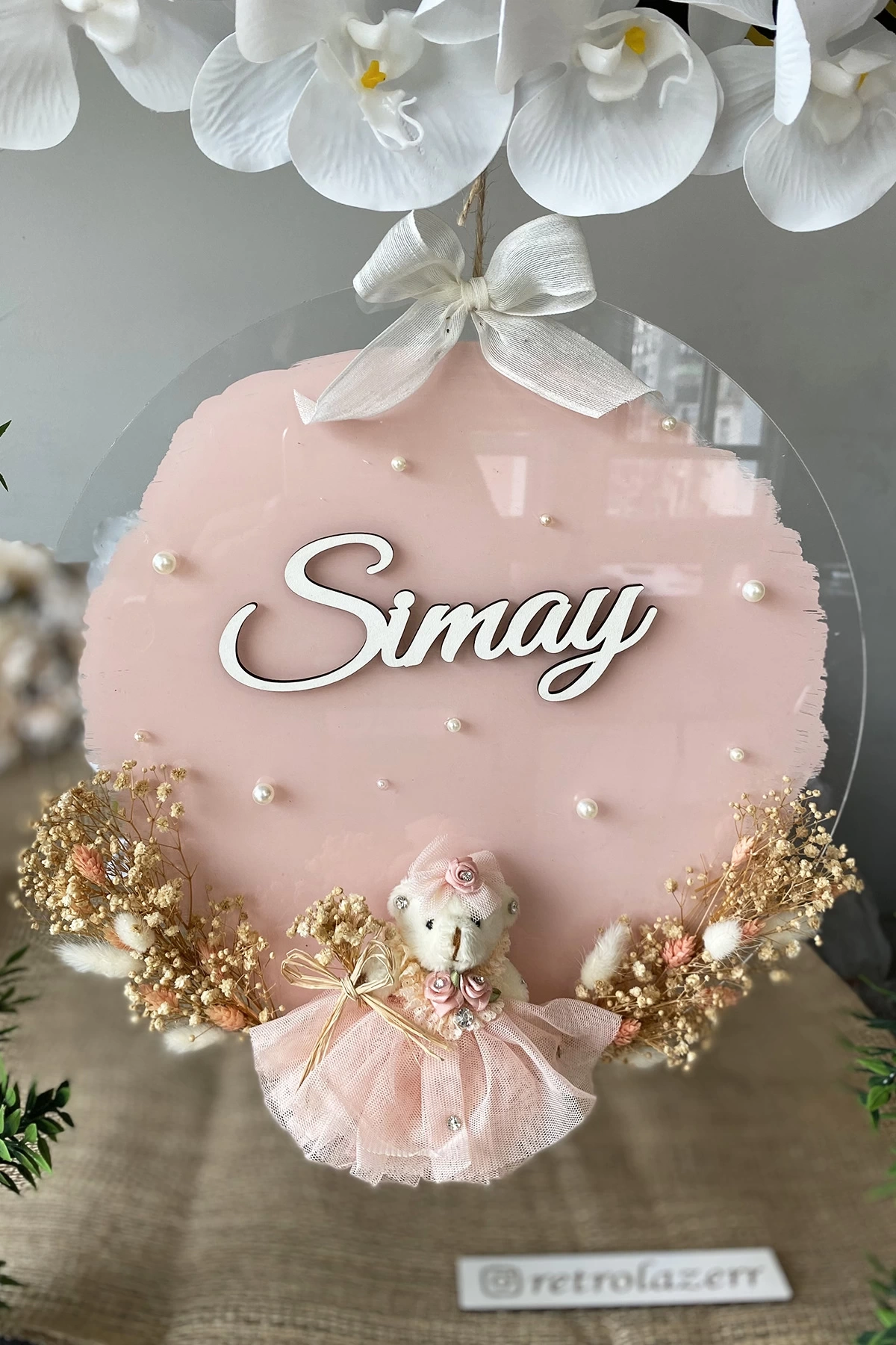 Şeffaf Boyalı Pleksi Peri Ayıcıklı Bebek Kapı Süsü İsimlik Makrome 30x30 cm
